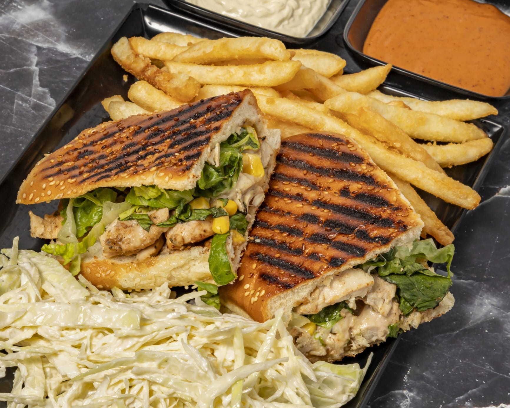 Seasoned grilled chicken fillet topped with mozzarella cheese, lettuce, corn, pickles, and homemade avocado sauce Make it a Combo: fries, salad of choice, 2 sauces