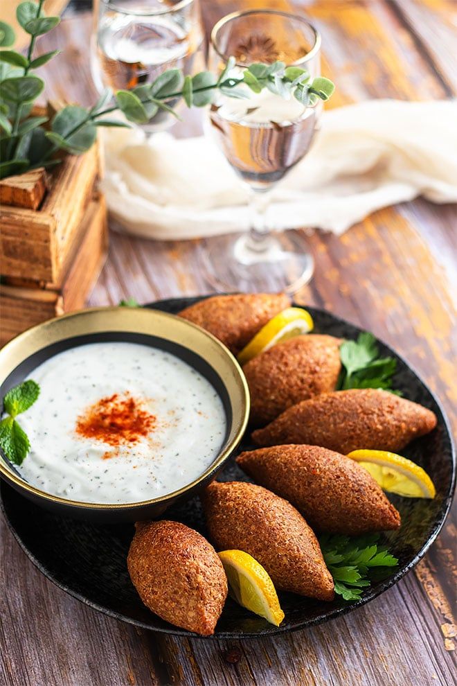 Four pieces of kibbeh , made with spiced ground meat, wrapped in a crunchy bulgur shell, and fried to golden perfection