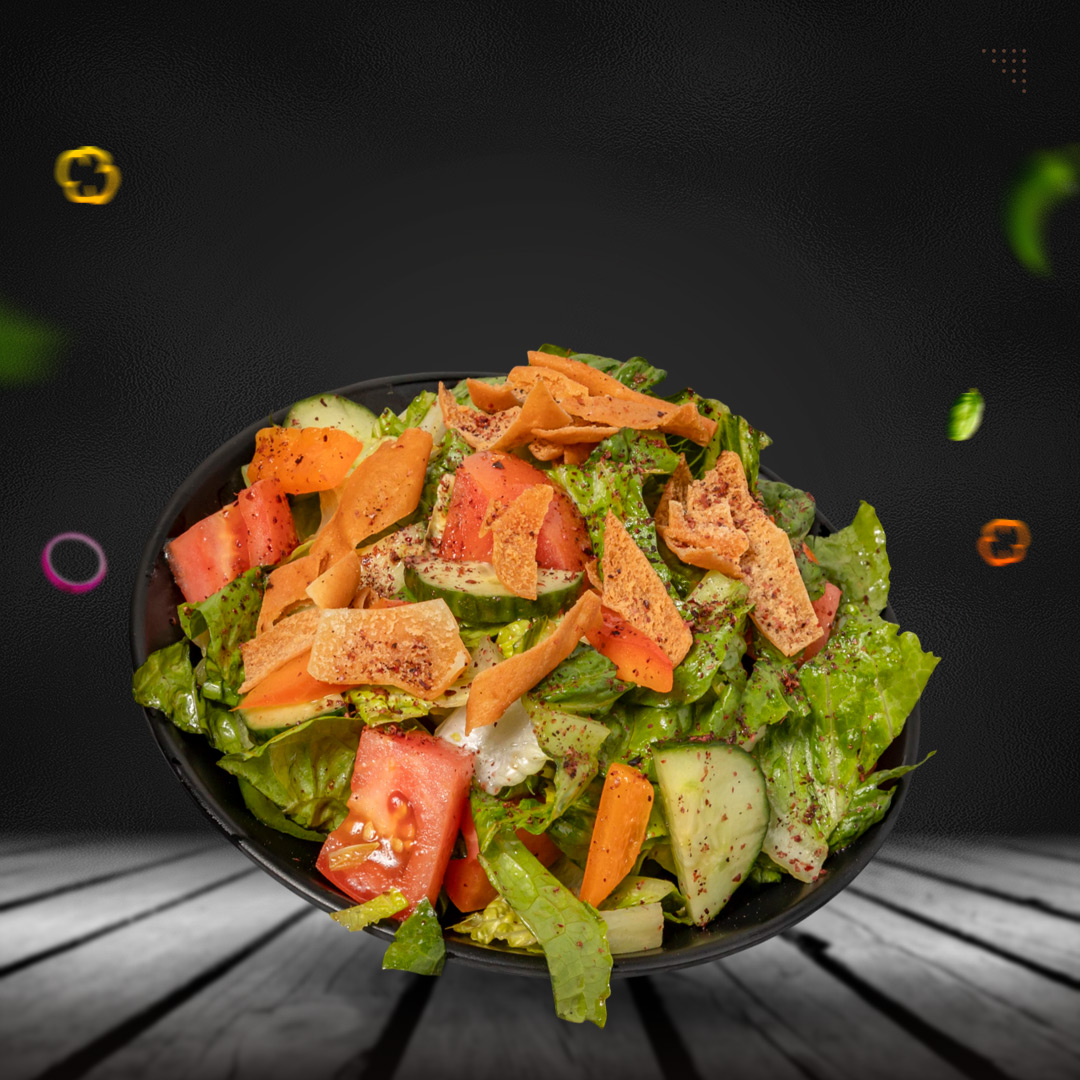 A fresh mix of crisp lettuce, tomatoes, cucumbers, and herbs, topped with crunchy pita chips and tossed in a lemon and olive oil dressing.